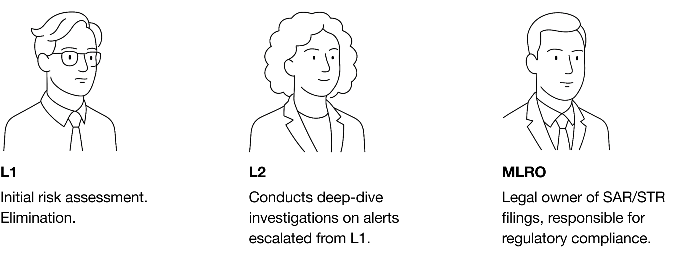 High-risk cases often involve multiple roles — analysts, investigators, team leads, and compliance officers — reviewing evidence, requesting information, and making escalation decisions.